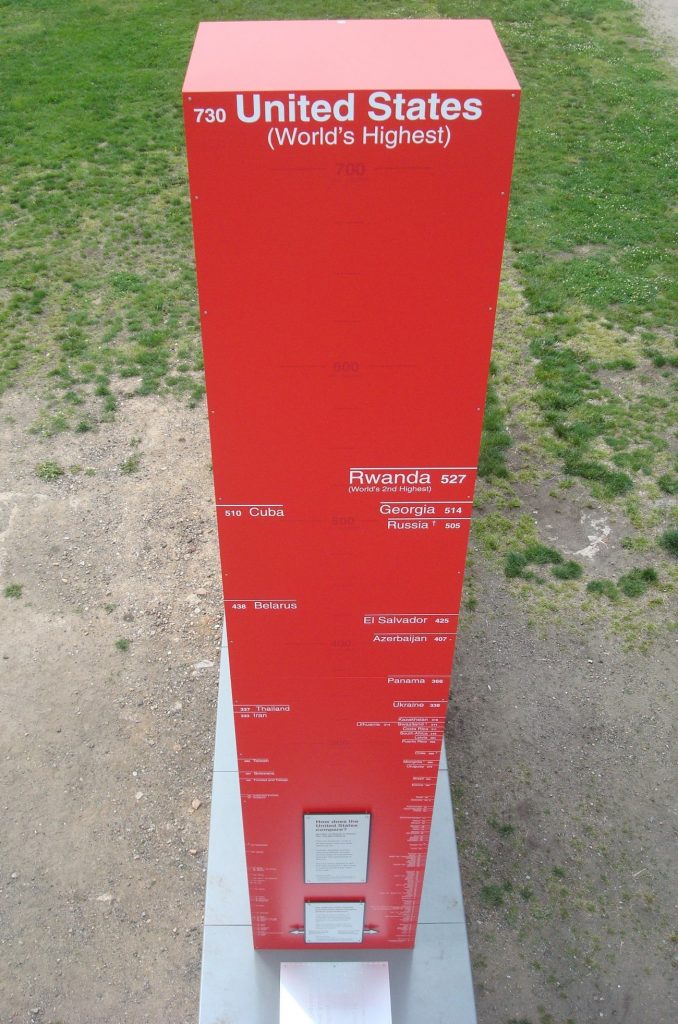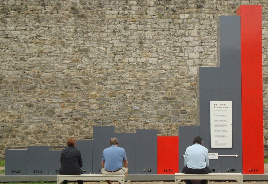 Long ago when the world was young, I followed my girlfriend to Philadelphia. Biking to work, I sometimes noticed, embedded in the drab urban fabric of asphalt and rowhouses, a massive, crenelated, slit-windowed, medieval fortress. Not till 2015, when I returned with my family, did I learn that it was the former Eastern State Penitentiary, an old prison built on the theories of a criminal justice reform movement of 200 years ago. It is a fantastic museum now: you must go. When we visited, we finished our self-guided audio tours in an interior courtyard, where inmates were once permitted to exercise. Now installed there is the Big Graph, a sculpture that puts America’s incarceration rate in historical and global perspective. This photograph of the Big Graph shows prisoners per 100,000 Americans by decade for 1900–2010: